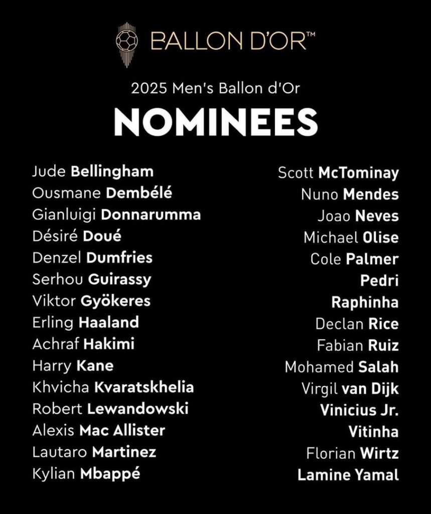 Vainqueurs autoritaires et somptueux de la Ligue des champions face à l’Inter Milan (5-0) et, plus classique, de la Ligue 1, de la Coupe de France et du Trophée des champions, les joueurs parisiens, battus seulement en finale de la nouvelle Coupe du monde des clubs par Chelsea (0-3), sont neuf, presque un tiers de la liste. Ousmane Dembélé, Gianluigi Donnarumma, Désiré Doué, Fabian Ruiz, Achraf Hakimi, Joao Neves, Khvitcha Kvaratskhelia, Nuno Mendes, Vitinha : il y a des attaquants, des milieux, des défenseurs, un gardien. Et aussi beaucoup de talent et de jeunesse.