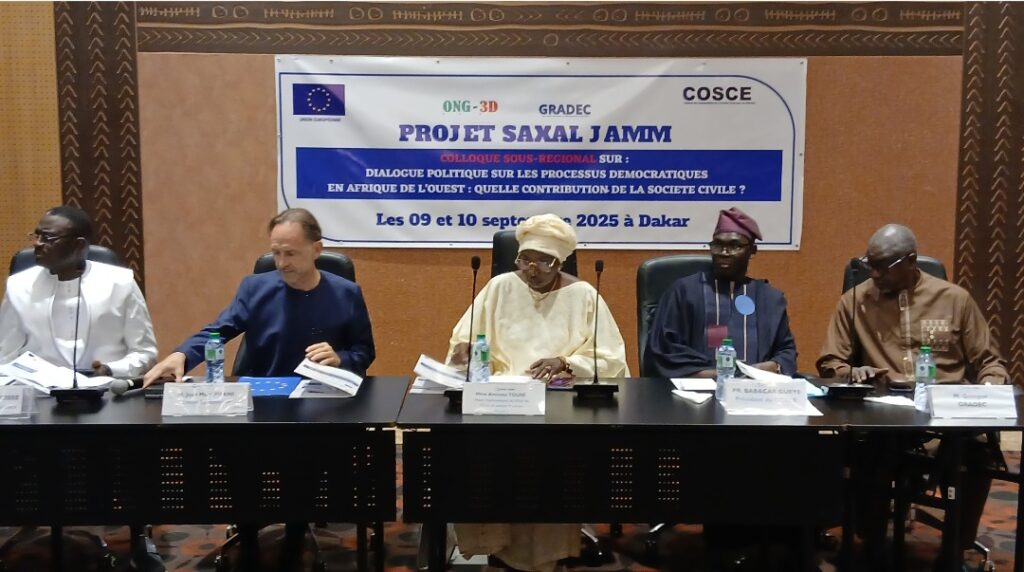 Dans le cadre du programme Saxal Jamm par l’ONG 3D, le COSCE et GRADEC, avec l’appui financier de l’Union européenne a organisé à Dakar un colloque régional sur « La contribution de la société civile dans la consolidation de la paix et la stabilité politique en Afrique de l’Ouest ». La rencontre, présidée par Mme Aminata Touré, ancienne Première ministre du Sénégal et Haut Représentant du Chef de l’État, a rassemblé des acteurs de haut niveau, dont M. Moundiaye Cissé, coordonnateur du COSCE, M. Jean-Marc Pisani, ambassadeur de l’Union européenne, le Pr Babacar Guèye, président du COSCE, ainsi que M. Gningue de GRADEC.