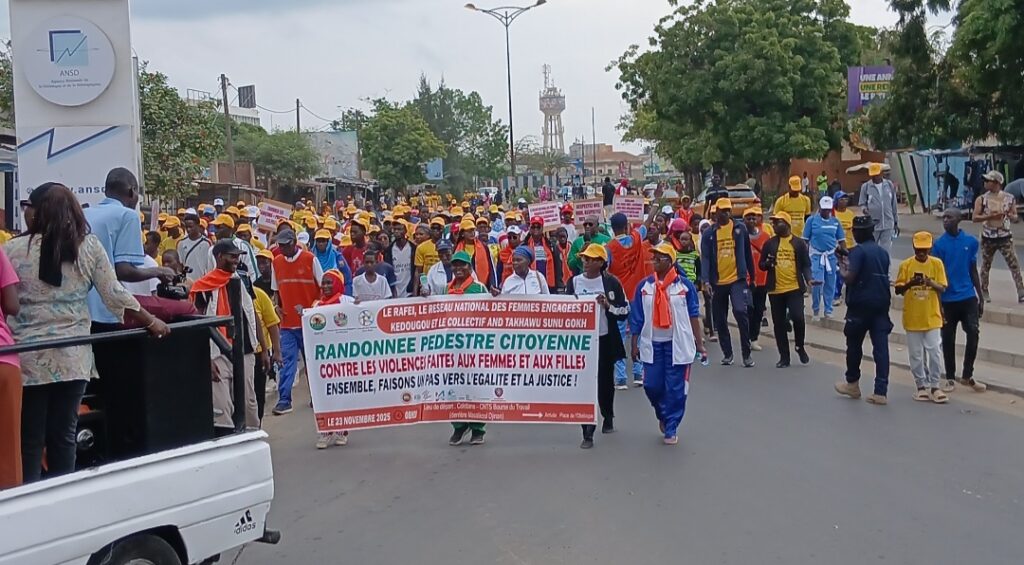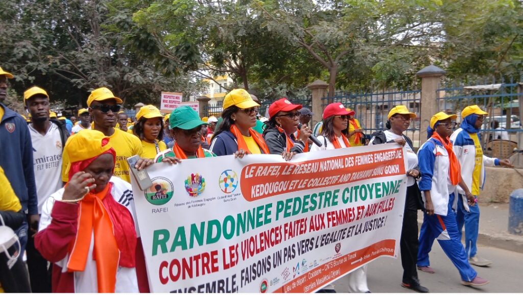 Dans le cadre des 16 jours d’activisme contre le Violences Basées sur le Genre (VBG), placés cette année sous le thème : » mettre fin à la violence numerique contre toutes les femmes et les filles », le RAFEI, le Réseau National des Femmes Engagées de Kédougou et le Collectif And Takhawu Sunu Gokh ont organisé, ce dimanche 23 novembre à Dakar, une randonnée pédestre de sensibilisation contre les violences faites aux femmes et aux filles.