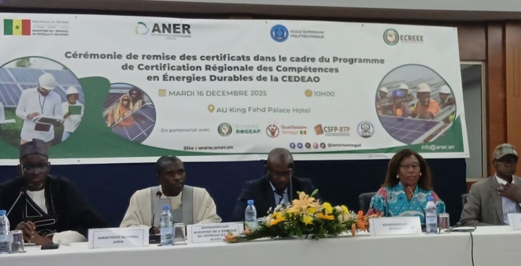 L’Agence Nationale pour les Énergies Renouvelables (ANER), en partenariat avec l’ECREEE et l’ESP, avec l’appui du projet ROGEAP, a organisé ce mardi 16 decembre 2025, une cérémonie de remise de certificats dans le cadre du Programme de Certification Régionale des Compétences en Énergies Durables de la CEDEAO. Ce programme a permis de former et certifier plusieurs cohortes de techniciens solaires photovoltaïques hors réseau, selon un référentiel régional harmonisé, garantissant la qualité, la sécurité et la professionnalisation du secteur.