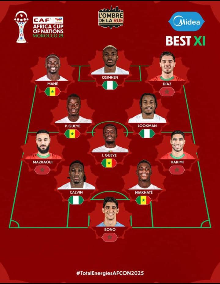 Avec quatre Sénégalais sélectionnés, le pays est le plus représenté dans ce XI, à égalité avec le vice-champion du continent, le Maroc, qui compte également quatre joueurs, dont Brahim Díaz, meilleur buteur de la CAN, et le meilleur de cette édition Bono. Le Nigeria suit avec trois représentants. Ik s’agit d’Osimhen du défenseur Calvin et de Lookman.